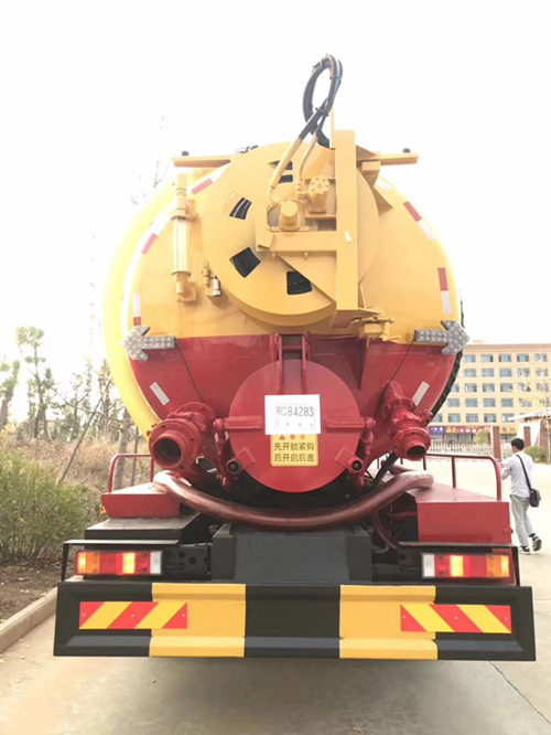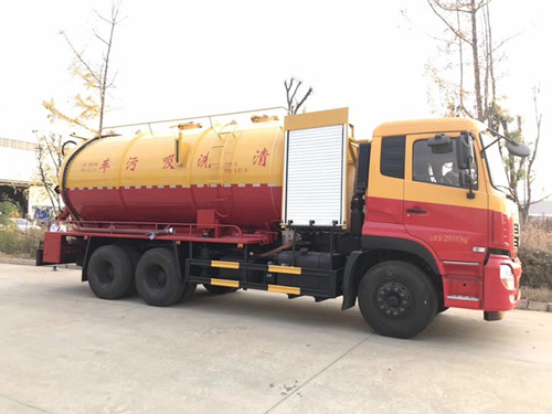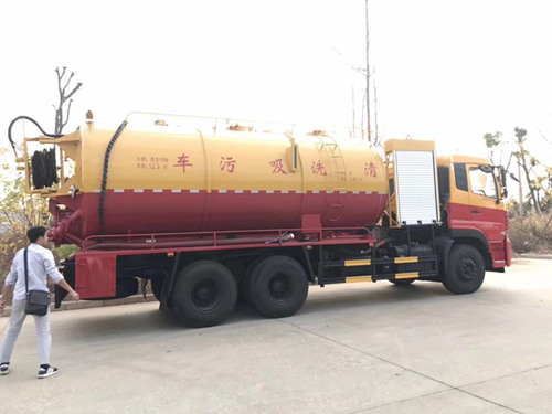 吳先生訂購的這輛東風天龍吸污車配置為:程力威高壓清洗吸污車,底盤型號:DFL1250A13,東風公司原裝底盤,新款駕駛室,法士特8檔變速箱,7T前橋,10T后雙橋,輪胎為11.00鋼絲胎,康機270發(fā)動機,正宗國五排放標準。根據客戶要求:該高壓清洗吸污車采用一體罐改裝,天津通潔270L泵,清水罐容積約5方,污水罐容積約15方,原廠空調,副發(fā)動機用的是420馬力濰柴。